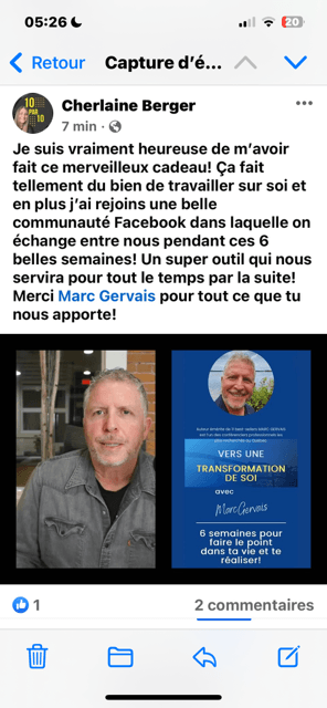 Auteur émérite de 13 best-sellers, MARC GERVAIS est l’un des conférenciers professionnels les plus recherchés au Québec. Avec des milliers de conférences à son actif, il s’adresse à son auditoire d'une façon unique, touchante et avec un humour qui n’appartient qu’à lui. Il en résulte un message direct et inspirant qui ne laisse personne indifférent. Offre-toi ce cadeau qui rehaussera ton estime, ta confiance ainsi que ton amour-propre.