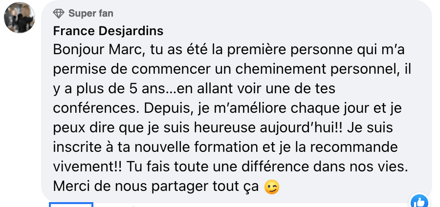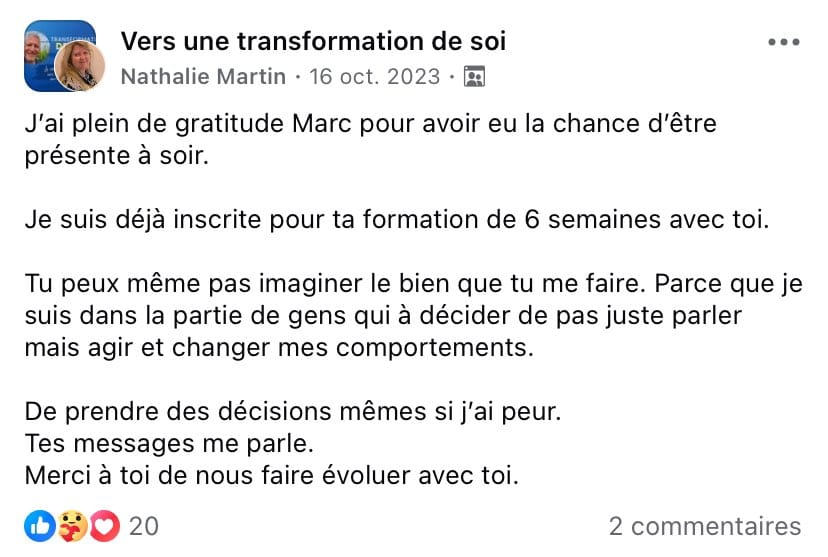 Si tu as écouté toutes les conférences et que tu as fait tous les exercices et que tu n’as aucun changement positif dans ta vie, je te rembourserai dans les 6 mois suivants l’achat de la formation.