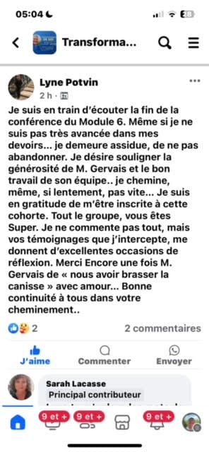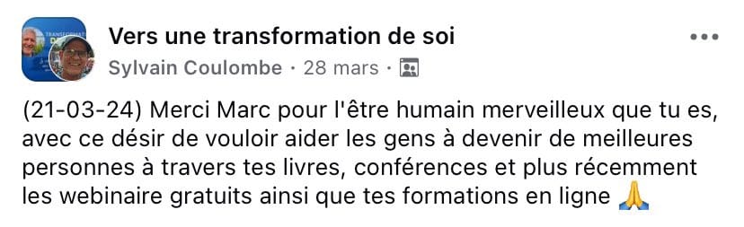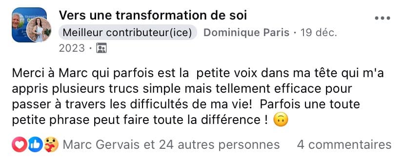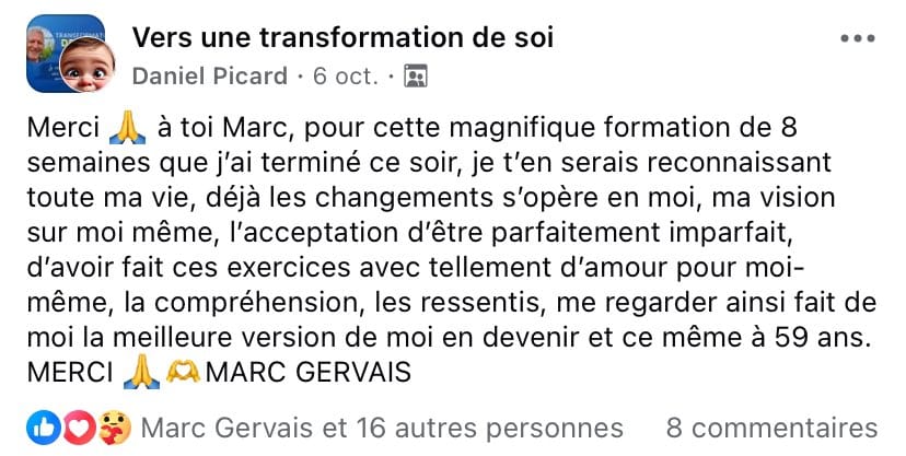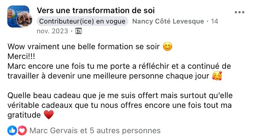 Absolument! J’offre 4 séances de questions-réponses en direct avec les participants de la formation. Ce sera un moment intime où partages et réalisations seront au rendez-vous. C’est réellement un plus à ce grand cheminement que tu t’apprêtes à commencer. Je serai également présent dans le groupe Facebook. Je ne pourrai pas répondre à tous, mais je t’encourage à profiter de la belle communauté que nous formons.