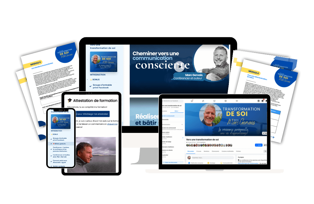 Tout le contenu de la formation, les bonus et les extra seront disponibles sur la plateforme d’apprentissage. Une fois ton inscription complétée, tu recevras les instructions pour te créer ton compte et accéder au groupe privé Facebook. En cas de question, tu peux communiquer avec mon équipe pour qu’on t’assiste : info@marcgervais.com.